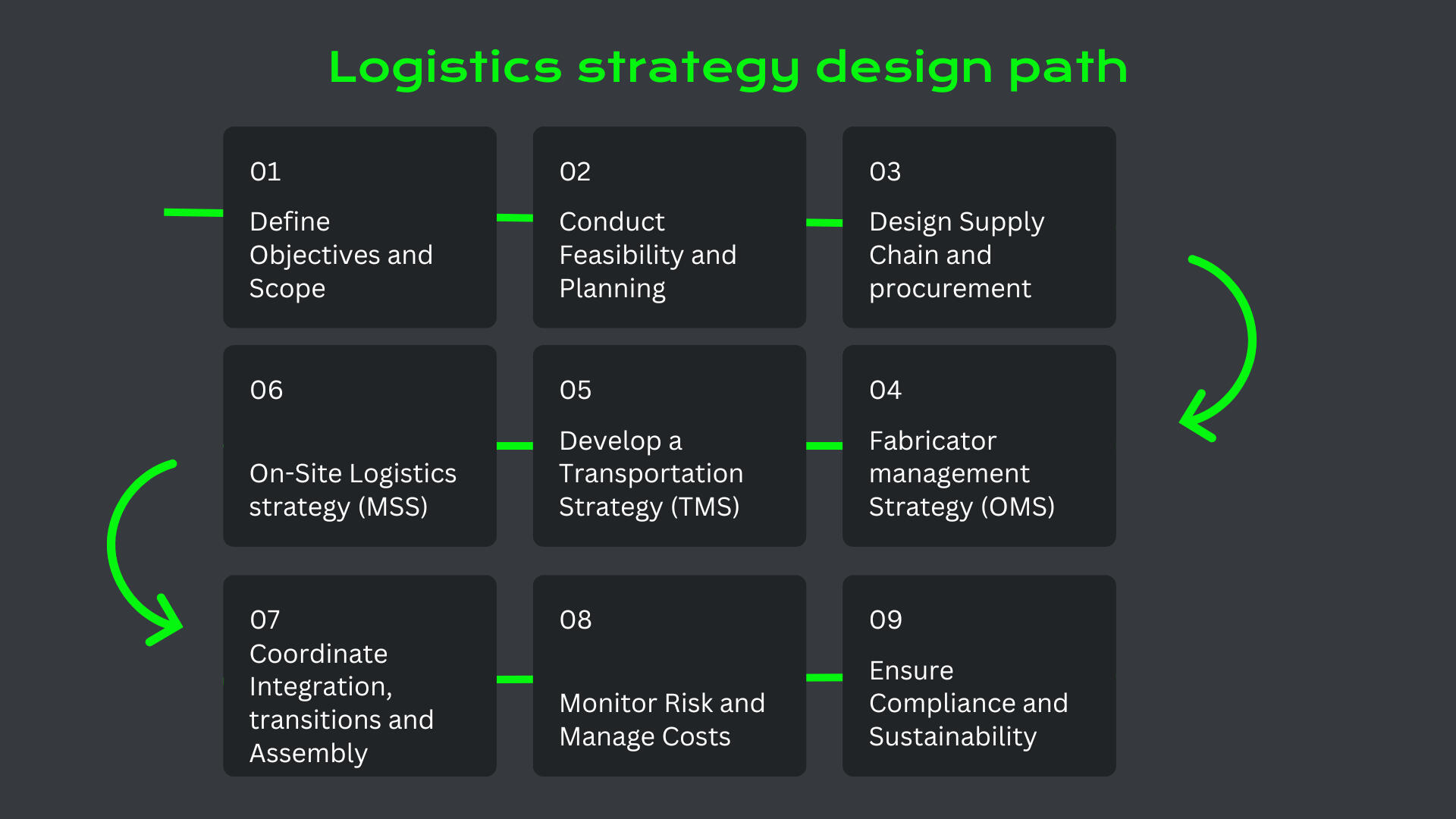 Our 9-step logistics strategy design path supports the constructability of modularization of construction projects. By establishing a continuous feedback loop between logistics and the engineering design of the modules, we ensure that every phase of the project is aligned with practical execution needs.